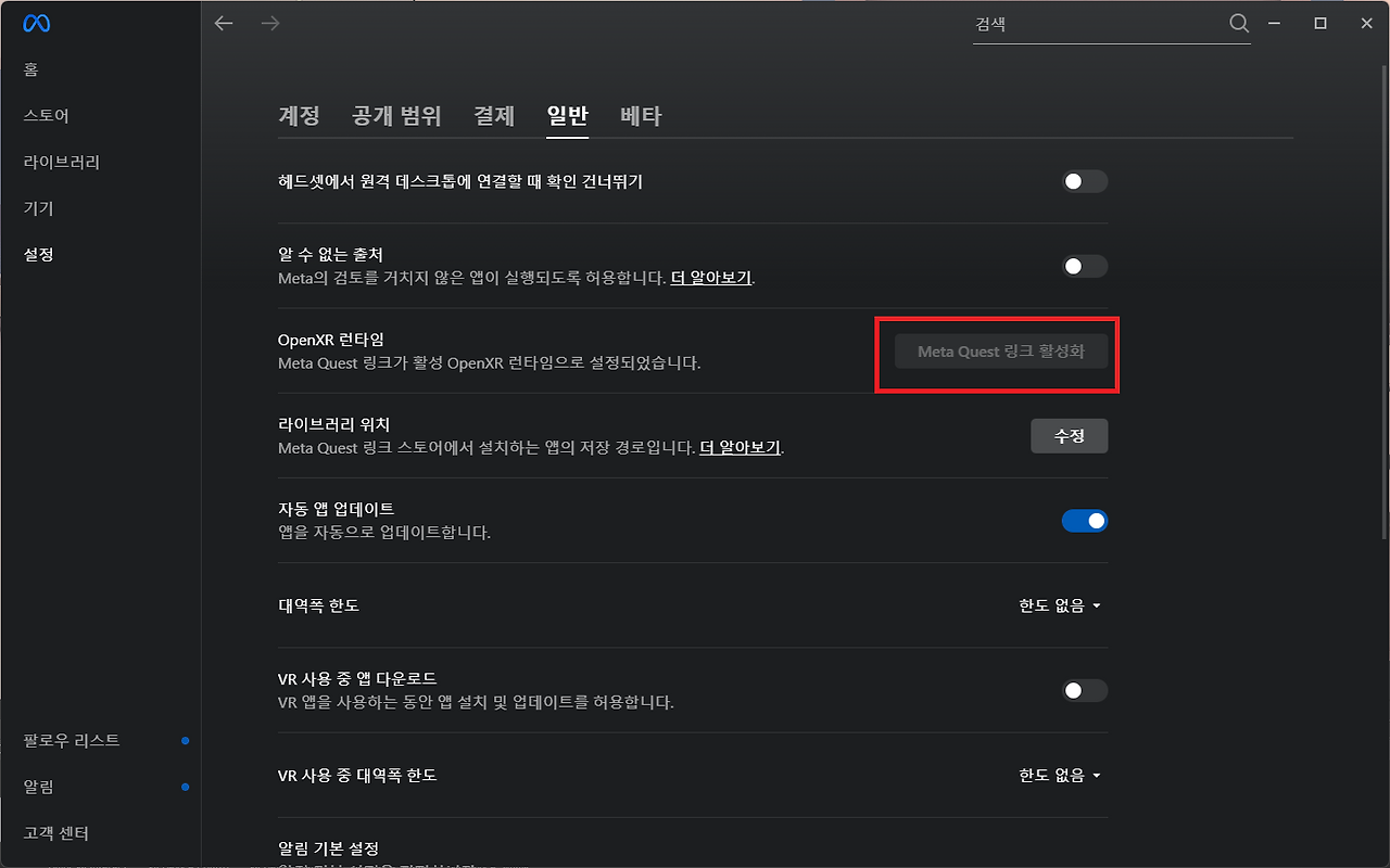 카테고리 없음 유니티로 VR게임 만들기 01 - 기초 세팅 by mynote6590 2025. 4. 9. 1. 메타 퀘스트 링크 다운 2. 다운 받은 메타 퀘스트 링크에서 런타임 활성화메타 퀘스트 링크 활성 3. 유니티 세팅 한가지 경고 메시지가 남게 되는데 edit을 눌러 수동 편집 해줍니다. 4. 유니티 vr 패키지 다운 5. 유니티에서 vr 사용 (2가지 프리팹을 하이라키 창에 넣어줍니다.) 6. 완료 - 플레이 버튼을 누르면 vr 캐릭터가 화면에 나옵니다. 공유하기 게시글 관리 함승윤