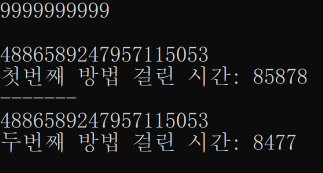 첫번째 방식 작동 시간 : 85878 ms 두번째 방식 작동 시간 : 8477 ms