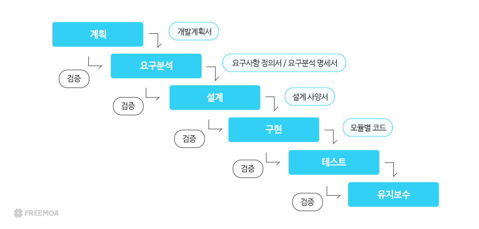 폭포수(Waterfall)방법론은 소프트웨어 개발 단계가 위에서 부터 아래로 폭포에서 물이 떨어지듯이 순차적으로 진행됩니다. 폭포수 방법론은 한단계씩 진행함에 따라 다시 이전 단계로 가지 않고 계속 진행하기에 다음 단계로 가기전에 완벽하게 요구사항을 반영하여 개발해야 합니다.