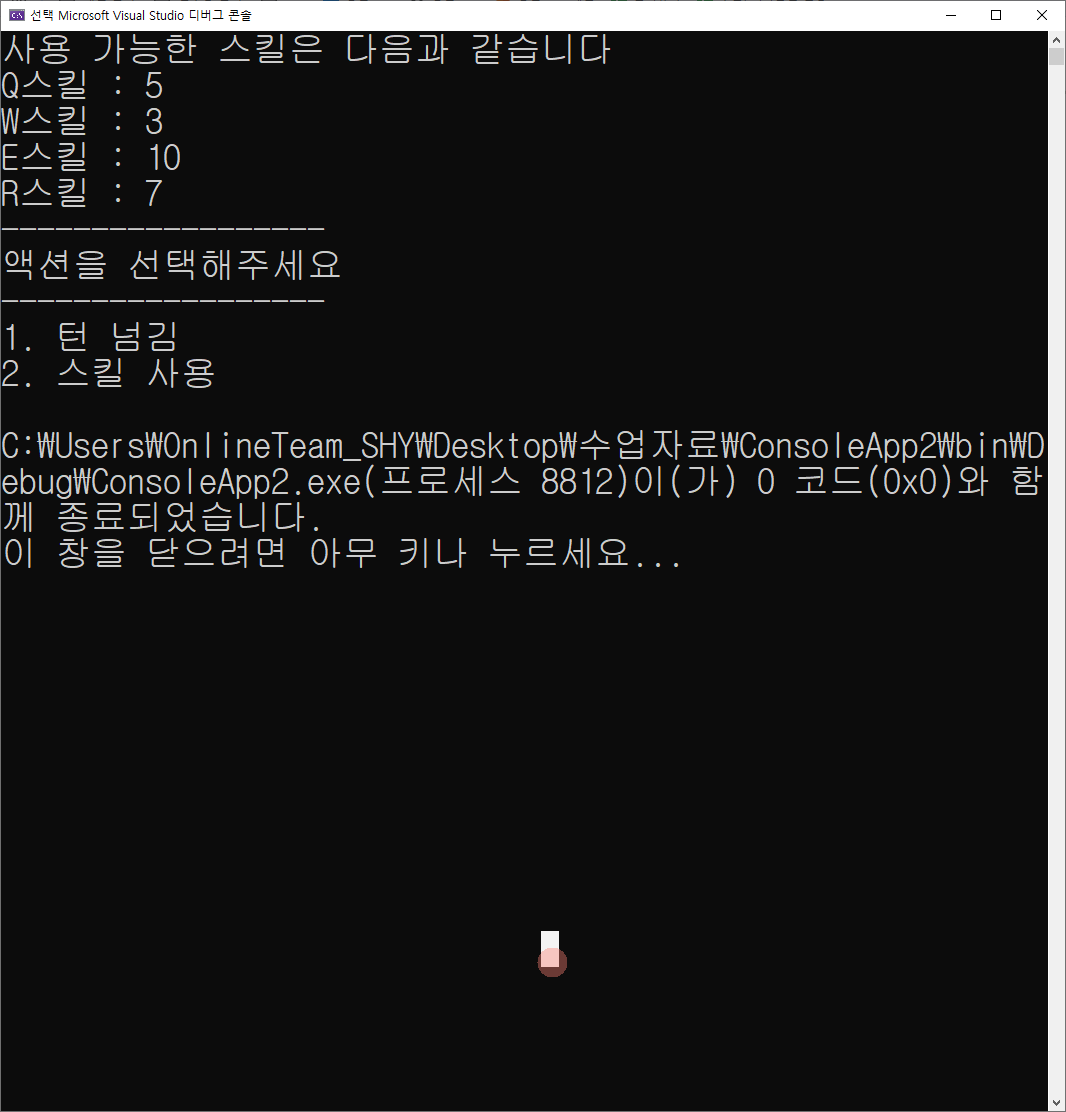 - 스킬을 선택하였다면, 어느 스킬을 사용할 지 입력받고 만약 그 스킬의 쿨타임이 0이면 다시 쿨타임 초기 숫자로 원복(Q는 5, W는3, E는 10, R은 7)